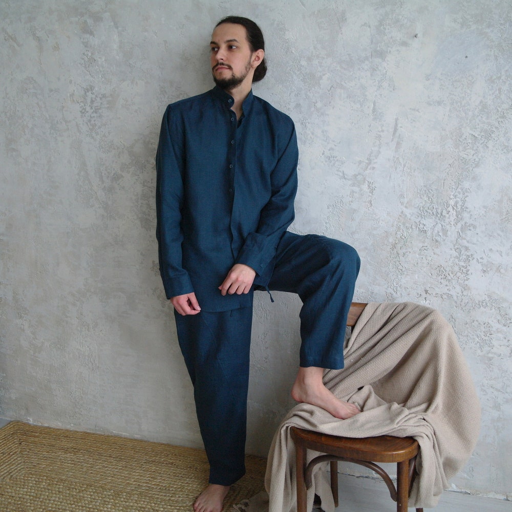 MEN’S Linen Set: button down shirt and elastic waist pants, OEKO-TEX linen Casual Mens Suit, Mid-weight Linen Suit for Men, Oganic Flax Suit
